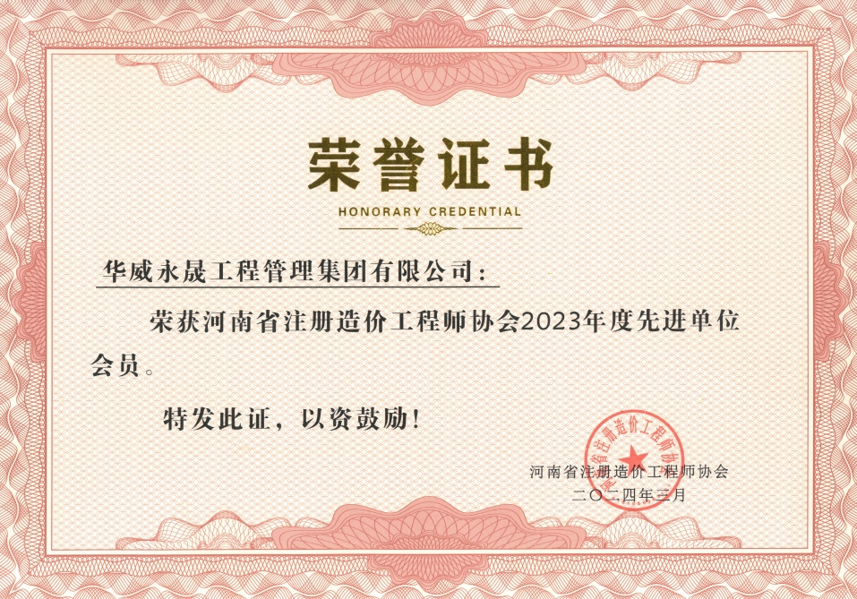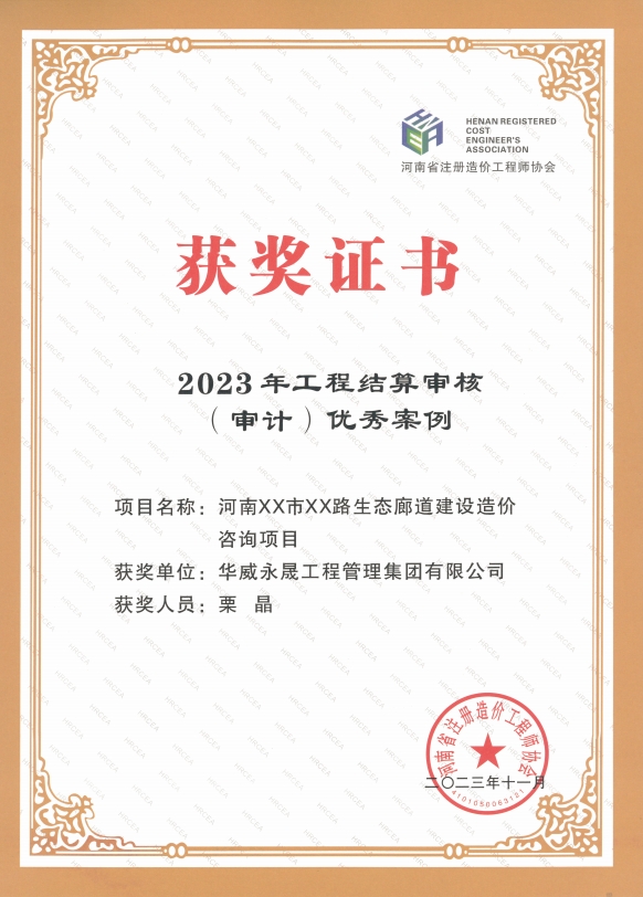 近日,我司荣获河南省注册造价工程师协会“2023年度先进单位会员”称号,《河南XX市XX路生态廊道建设造价咨询项目》、《某市职教园区建设造价咨询项目》、《某地产项目工程造价鉴定案例》三个项目被河南省注册造价工程师协会评为优秀案例。